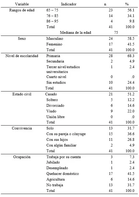 1. Concha-Cisternas Y, Vargas-Vitoria R, Celis-Morales C. Cambios morfofisiológicos y riesgo de caídas en el adulto mayor: una revisión de la literatura. Salud Uninorte. 2020;36(2):450-70. https://doi.org/10.14482/sun.36.2.618.97 2. Pinilla Cárdenas MA, Ortiz Álvarez MA, Suárez-Escudero JC. Adulto mayor: envejecimiento, discapacidad, cuidado y centros día. Revisión de tema. Salud Uninorte. 2021;37(2):488-505. https://doi.org/10.14482/sun.37.2.618.971 3. Consejo de Igualdad Intergeneracional. Estado de situación de las personas adultas mayores. Quito: Consejo de Igualdad Intergeneracional; [Fecha desconocida]. Disponible en: https://www.igualdad.gob.ec/estado-de-situacion-de-las-personas-adultas-mayores/ [Consultado 20-09-2024] 4. Cancio-Bello Ayes C, Lorenzo Ruiz A, Alarcó Estévez G. Autocuidado: una aproximación teórica al concepto. Informes Psicol. 2020;20(2):119-38. https://doi.org/10.18566/infpsic.v20n2a9 5. World Health Organization. WHOQOL: User Manual. Geneva: World Health Organization; 2012. Disponible en: https://www.who.int/tools/whoqol [Consultado 20-09-2024] 6. Gutiérrez-Herrera RF, Ordóñez-Azuara YG, Hartmann-Nava J. Calidad de vida en el adulto mayor en Monterrey, Nuevo León y su Área Metropolitana. Rev Varona. 2023;76. Disponible en: http://scielo.sld.cu/scielo.php?script=sci_arttext&pid=S1992-82382023000100012&lng=es&tlng=es [Consultado 20-09-2024] 7. Organización Mundial de la Salud. Ginebra: Organización Mundial de la Salud; Envejecimiento y Salud; [Fecha desconocida]. Envejecimiento y salud; 1 de octubre de 2024. Disponible en: https://www.who.int/es/news-room/fact-sheets/detail/ageing-and-health [Consultado 20-09-2024] 8. Euskadi. Departamento de Salud. Bilbao: Gobierno Vasco, Departamento de Salud; [Fecha desconocida]. Envejecimiento en Europa: una mirada a las personas mayores; 10 de febrero de 2020. Disponible en: https://arretasoziosanitarioa.euskadi.eus/websosa00-content/es/contenidos/noticia/not_sosa_envejecimiento_en_eu/es_def/index.shtml [Consultado 20-09-2024] 9. Arias C, Soliverez C, Bozzi N. El envejecimiento poblacional en América Latina. RELASP. 2020;2(1):11-23. https://doi.org/10.35305/rr.v1i2.18 10. Instituto Nacional de Estadística y Censos. Quito: Instituto Nacional de Estadística y Censos; [Fecha desconocida]. INEC estima que, según proyecciones en el mediano plazo, Ecuador tendrá más adultos mayores, menos niños y adolescentes en 2050; 19 de febrero de 2024. Disponible en: https://www.ecuadorencifras.gob.ec/ecuador-tendra-mas-adultos-mayores-menos-ninos-y-adolescentes-en-2050/ [Consultado 20-09-2024] 11. Echevarría A, Astorga C, Fernández C, Salgado M, Villalobos Ditrans P. Funcionalidad y personas mayores: ¿dónde estamos y hacia dónde ir? Rev Panam Salud Pública. 2022;46;e34. https://doi.org/10.26633/RPSP.2022.34 12. Du M, Kong H, Ran L, Ran Y, Bai L, Du Y et al. Associations among health-promoting lifestyle, self-care agency and health-related quality of life in Bai older adults with hypertension in Yunnan China. BMC Geriatrics. 2022;22:942. https://doi.org/10.1186/s12877-022-03608-0 13. Avilés-Silva Y, Horta Martínez LE, González Rodríguez AL, Sorá Rodríguez M, Morales Cáseres W, Izquierdo Molina R. Estado del autocuidado en pacientes de la tercera edad de un consultorio médico habanero. Rev 16 abril. 2023;62:e1748. Disponible en: https://rev16deabril.sld.cu/index.php/16_04/article/view/1748 [Consultado 20-09-2024] 14. Mejía-Álvarez ET, Guerrero-Morán PE, Villarreal-Ger MC. Autocuidado en adultos mayores con independencia funcional, que acuden al Centro de Salud “Priorato”. Rev Cienc Méd Pinar Río. 2023;27(Supl 1):e6077. Disponible en: https://revcmpinar.sld.cu/index.php/publicaciones/article/view/6077 [Consultado 20-09-2024] 15. Olusanya BO, Davis AC, Hoffman HJ. Hearing loss grades and the International classification of functioning, disability and health. Bull W.H.O. 2019;97(10):725-8. https://doi.org/10.2471/BLT.19.230367 16. Velandia Arias A, Rivera Álvarez LN. Confiabilidad de la escala “Apreciación de la agencia de autocuidado” ( ASA ), segunda versión en español, adaptada para población colombiana. Av Enferm. 2009;XXVII(1):38-47. Disponible en: http://www.scielo.org.co/scielo.php?script=sci_arttext&pid=S0121-45002009000100005&lng=e [Consultado 01-09-2024] 17. Evers GCM, Isenberg MA, Philipsen H, Senten M, Brouns G. Validity testing of the Dutch translation of the appraisal of the self-care agency A.S.A.-scale. Internat J Nurs Stud. 1993;30(4):331-42. https://doi.org/10.1016/0020-7489(93)90105-4 18. Sousa VD, Zauszniewski JA, Bergquist-Beringer S, Musil CM, Neese JB, Jaber AF. Reliability, validity and factor structure of the Appraisal of Self-Care Agency Scale – Revised (ASAS-R). J Eval Clin Pract. 2010;16(6):1031-40. https://doi.org/10.1111/j.1365-2753.2009.01242.x 19. Van Achterberg T, Lorensen M, Isenberg MA, Evers GC, Levin E, Philipsen H. The Norwegian, Danish and Dutch Version of the Appraisal of Self-care Agency Scale; Comparing Reliability Aspects. Scand J Caring Sci. 1991;5(2):101-8. https://doi.org/10.1111/j.1471-6712.1991.tb00091.x 20. Manrique-Abril F, Fernández A, Velandia A. Análisis factorial de la Escala Valoración de Agencia de Autocuidado (ASA) en Colombia. Aquichan. 2009;9(3):222-35. Disponible en: http://www.scielo.org.co/scielo.php?script=sci_arttext&pid=S1657-59972009000300003&lng=en&nrm=iso&tlng=es [Consultado 20-02-2025] 21. Herrera-Pineda IV, Díaz-Amador Y, Maggi-Garcés BL, Colmenares-Robles ZC, Moya-Plata D, Monserrate-Cervantes JO. Variables predictoras de Diabetes mellitus Tipo 2 asociadas a conductas de autocuidado. Rev Cubana Enferm. 2021;37(3):e3878. Disponible en: https://revenfermeria.sld.cu/index.php/enf/article/view/3878/760 [Consultado 01-10-2024] 22. Hernández-Navor JC, Guadarrama-Guadarrama R, Castillo-Arrellano SS, Arzate Hernández G, Márquez-Mendoza O. Validación del WHOQOL-OLD en adultos mayores de México. Psiencia. Rev. latinoa