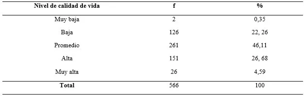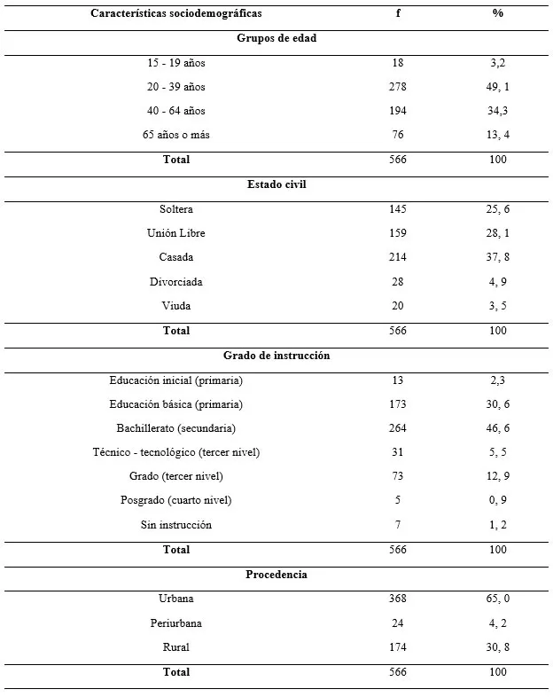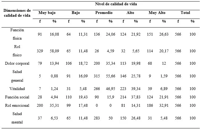 Introducción La calidad de vida se define como la percepción individual del estado funcional de un individuo, influenciada por factores subjetivos y contextuales1 en relación con sus objetivos, reglas e intereses, en el contexto social y sistema de valores en el cual se desenvuelve2. Es decir, comprende el grado de bienestar percibido, determinado por el componente objetivo (nivel de salud en general y situación de vida)3 y subjetivo (realización personal y sensación de plenitud)4. Para el año 2050, se estima que la población mundial alcanzará los 9700 millones de personas. Sin embargo, las tasas de fecundidad han disminuido en las últimas décadas, situándose actualmente en 2.1 nacimientos por mujer. Como consecuencia, la población mayor de 65 años aumentará del 10 % al 16 % para ese mismo año, lo que impactará en la esperanza de vida global5. Un estudio realizado en México en una población de mujeres con rango de edad entre 60 a 75 años, determinó que aquellas que cumplen con las recomendaciones médicas sobre la actividad física poseen mejores percepciones sobre su calidad de vida, especialmente en el funcionamiento físico y las limitaciones para realizar las actividades diarias, lo que se encuentra relacionado con su bienestar y salud general6. Una investigación en Ecuador reveló que los grupos vulnerables, especialmente de bajos recursos, enfrentan mayores obstáculos en salud, aumentando el riesgo de enfermedades crónicas. Además, la falta de servicios básicos y la violencia agravan las desigualdades, afectando la calidad de vida y evidenciando el impacto de los determinantes sociales en la salud7. Existen diferencias entre el sexo masculino y femenino frente a necesidades en el ámbito de salud, así como al control y acceso a recursos, las cuales deben abordarse para corregir desequilibrios8. De esta forma, las mujeres tienen riesgo de desarrollar síntomas depresivos, relacionados con las oportunidades personales9. Así mismo las experiencias traumáticas a una edad temprana, como la violencia sexual, trabajo no remunerado y diversas formas de discriminación, afectan significativamente a la calidad de vida percibida por la mujer10. Por lo tanto, la percepción de calidad de vida influye sobre el estado de salud11. Es por ello que el presente estudio tuvo como finalidad identificar el panorama actual del nivel de calidad de vida (CV) que mantienen las mujeres, ya que la información que se obtiene es valiosa para los profesionales del área de la salud interesados en el desarrollo de programas de promoción en salud, además de fomentar el autocuidado en las mujeres durante su papel de cuidadora, madre y paciente12. Frente a los antecedentes mencionados anteriormente, el objetivo general de la presente investigación fue analizar la calidad de vida en mujeres que acuden al Hospital General Isidro Ayora y los objetivos específicos fueron: determinar las características sociodemográficas del grupo de estudio, identificar el nivel de la calidad de vida y describir las dimensiones de la calidad de vida. Métodos El estudio se enmarcó en el diseño cuantitativo, descriptivo y transversal, realizado en el año 2024. El área de estudio fue el Hospital General Isidro Ayora de Loja (HGIAL), ubicado en una ciudad al Sur del Ecuador. La población estuvo conformada por 566 mujeres en calidad de paciente, madre y/o cuidadora que acudieron a los servicios de cirugía, gineco obstetricia, pediatría, neonatología y medicina interna del HGIAL. Estos datos fueron obtenidos de los registros de estadísticas y censos de ingresos. Por cada servicio, se calculó el promedio mensual de ingresos y este valor se consideró como población total para el estudio. La selección de las participantes se realizó de manera aleatoria simple manual durante el periodo de estudio. Para ello, se asignó un número único en una lista según el orden de ingresos, posteriormente los números fueron seleccionados manualmente al azar. Los criterios de inclusión fueron: mujeres desde los 15 años en adelante que autorizaron su participación mediante el consentimiento informado, adolescentes con asentimiento y autorización de sus padres o representantes. Los criterios de exclusión fueron: mujeres menores de 15 años o que no pertenezca a los servicios indicados, personal femenino de la institución, quienes no desearon participar, hablen idiomas distintos al español o tengan alguna discapacidad que impida completar el cuestionario. La técnica que se empleó fue la encuesta y como instrumento el cuestionario denominado SF-36 (Short Form Health Survey), elaborado a inicio de los años noventa en Estados Unidos y modificado a través de los años, estuvo validado mediante 5 jueces expertos y por pruebas estadísticas Kaiser-Meyer-Olkin, con un valor de 0,901 y la prueba de Bartlett con un valor de Sig. 0,000; gl 630; x2 6010,317 confirmando su validación, igualmente, a la confiabilidad la obtuvieron mediante el alfa de Cronbach, cuyo valor fue de 0,82713. Al cuestionario SF-36 se agregaron las variables sociodemográficas (edad, estado civil, grado de instrucción y procedencia), que permitieron conocer las características generales de la población, mientras que, la segunda parte está constituida por 36 ítems distribuidos en 9 dimensiones (nivel de calidad de vida, función física, rol físico, dolor corporal, salud general, vitalidad, función social, rol emocional y salud mental) las cuales son calificadas mediante una escala tipo Likert con 5 opciones de respuesta y finalmente el valor de la variable calidad de vida comprende las siguientes categorías: calidad de vida muy baja (0-20 puntos), baja (21-40 puntos), promedio (41-60 puntos), alta (61-80 puntos) y muy alta (81 a 100 puntos)14. La tabulación de datos se realizó en dos etapas. Primero, los valores numéricos por cada pregunta fueron recodificados en el rango de 0 a 10013. En la segunda etapa, se sumaron los valo