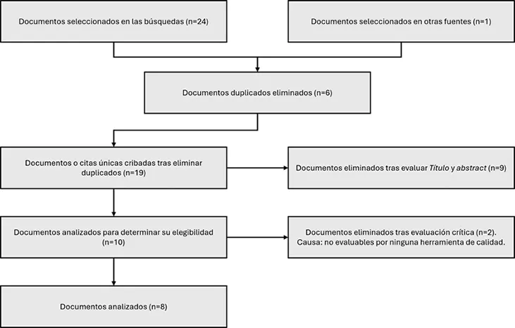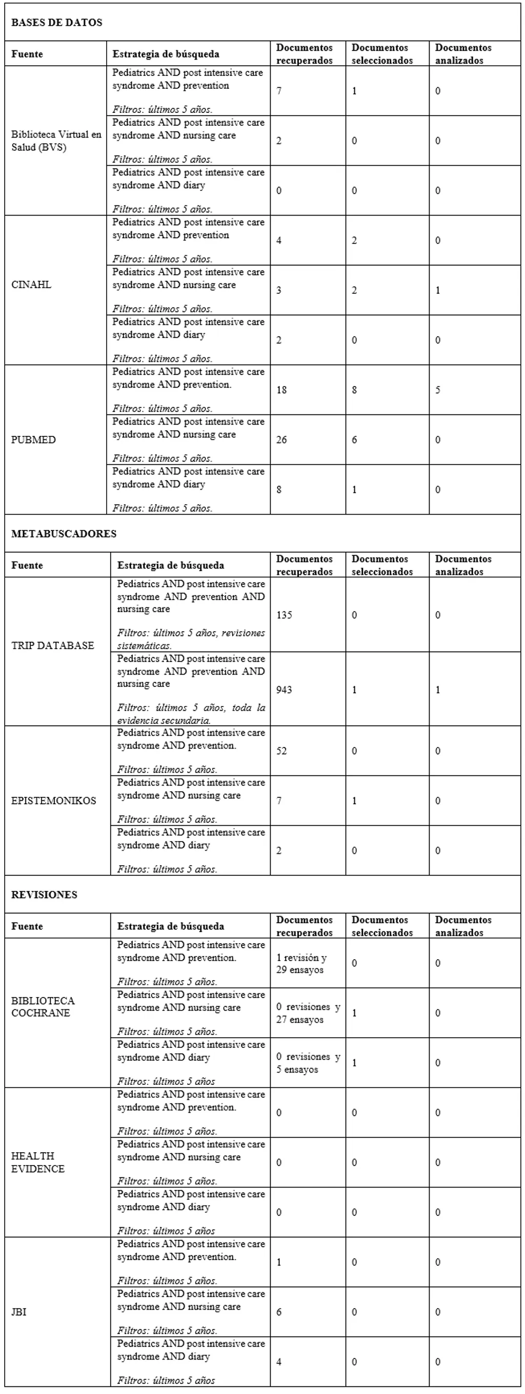 Fuentes de búsqueda Una vez establecida nuestra pregunta de investigación, se procedió a realizar una búsqueda exhaustiva de toda la evidencia clínica disponible en los últimos cinco años, destacando Pubmed, Cinahl, Trip database, Epistemonikos, Biblioteca Cochrane, Health Evidence y JBI, con el fin de disponer de una información actualizada que tuviese el mayor grado de calidad posible. Criterios de búsqueda: descriptores, operadores y limitadores. Antes de comenzar la búsqueda, se establecieron las palabras clave de la investigación traducidas a lenguaje documental, con los descriptores DeCS (Descriptores en Ciencias de la Salud). Tabla 2. Traducción al lenguaje documental. ![]() Cabe resaltar que no fue posible encontrar ningún descriptor para síndrome post cuidados intensivos, por lo que se intentó hacer una búsqueda desde el índice jerárquico. Sin embargo, no fue exitosa. Es por ello por lo que se decidió indagar usando las palabras clave directamente. Como limitadores empleamos el idioma, seleccionando español e inglés y la fecha de publicación, filtrando a los últimos 5 años (2019-2024). Por último, se usaron diferentes estrategias de búsqueda usando el operador booleano AND entre los distintos descriptores, haciendo varias combinaciones entre ellos y realizando la búsqueda en las fuentes mencionadas en el apartado anterior (Anexo 1). Resultados Ilustración 3. Flujograma. ![]() En el anexo 1 se pueden ver los documentos recuperados, número de artículos que encontramos tras la búsqueda realizada; pero los que realmente contamos e introdujimos en el primer paso de nuestro flujograma, son los documentos seleccionados, los cuales son adecuados a los criterios de inclusión y exclusión establecidos. Por último, los documentos analizados son los que han pasado la herramienta de calidad y, por tanto, hemos utilizado en esta revisión bibliográfica. Destacar también que, para reducir el número de duplicados, permitiéndonos trabajar con números más pequeños, no se incluyeron artículos previamente ya seleccionados con otra estrategia de búsqueda en la misma fuente. Evaluación crítica de los elementos analizados. Individualmente, tras una lectura crítica de los diferentes documentos, pasamos las respectivas herramientas de calidad según el tipo de estudio, consensuándolo posteriormente en común. Los estándares de publicación o checklist de lectura crítica utilizados fueron: