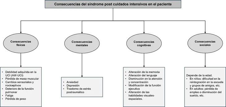 Introducción. Marco conceptual En el último cuarto del siglo XX, ha sido esencial el aumento de los conocimientos, la innovación técnica y los protocolos para estandarizar los procedimientos y cuidados proporcionados en las Unidades de Cuidados Intensivos (UCI)1. Todo esto ha contribuido directamente a un incremento de la tasa de supervivencia de pacientes críticos2. En la actualidad, las Unidades de Cuidados Intensivos Pediátricas (UCIP) reportan tasas de mortalidad bajas (2-4%), cifras similares a las de los adultos3, quedando en segundo plano, posiblemente, las necesidades humanas y emocionales de pacientes, familias y profesionales4. Para garantizar unos cuidados de calidad, es necesario visualizar al paciente de forma holística, lo cual nos lleva al concepto de humanización. La humanización consiste en enfocarnos en la persona a la que atendemos, teniendo en cuenta su individualidad, respetando su dignidad y valores, prestándole cuidados basados en la mejor evidencia existente y haciendo un uso responsable de los recursos disponibles. Además, incluye a los familiares, que los hace participar de forma activa en el proceso, y a los profesionales sanitarios, recordándoles su vocación y dedicación5. Los pacientes críticos pueden enfrentarse a numerosas intervenciones invasivas, las cuales son indispensables para su proceso de recuperación, como pueden ser la ventilación mecánica, la intubación endotraqueal, la inserción de tubos torácicos, el cateterismo venoso y arterial central o la administración intensiva de medicación, entre otros6. El uso prolongado de la ventilación mecánica (VM) implica riesgos como la necesidad de una sedación más profunda, la cual está estrechamente relacionada con una inestabilidad hemodinámica, inmovilización, infecciones nosocomiales, aumento de la abstinencia y el delirio. Todo ello resulta en una mayor duración de la estancia en la UCIP7. Por otro lado, un estudio ha determinado que un elevado porcentaje de niños están preparados para la extubación antes de comprobar la adaptación al destete. Esto conlleva un aumento del riesgo de una ventilación innecesariamente prolongada7. Además, es preciso un nivel de sedación adecuado, evitando la infra o sobresedación, ya que aumenta el riesgo de VM prolongada, inestabilidad hemodinámica, abstinencia y delirio7. A pesar de los evidentes beneficios, esta supervivencia lleva asociada una serie de morbilidades físicas, cognitivas y mentales que afectan directamente al paciente post crítico y a sus familias, incluso, producen un aumento del gasto de los recursos sanitarios8. Dicho fenómeno es lo que se conoce como síndrome post cuidados intensivos (PICS). Se estima que en torno a un 30-50% de los pacientes adultos que se encontraban en estado crítico, desarrollarán posteriormente el PICS. Por otro lado, el 70-100% de ellos sufrirán disfunciones cognitivas, y solamente el 49% retomará su trabajo en los doce meses posteriores al alta9. En cuanto a los pacientes pediátricos, tras el alta, se observa que entre el 20 y 30% de ellos tienen una calidad de vida relacionada con la salud significativamente más baja, en comparación con sus pares sanos tres meses después de su estancia en UCIP10. El PICS fue definido oficialmente en 2012 por la Sociedad de Medicina de Cuidados Críticos (SCCM) en una conferencia como deficiencias nuevas o que empeoran en el estado de salud física, cognitiva o mental, que surgen después de una enfermedad crítica y que persisten más allá de la hospitalización en cuidados intensivos11. La necesidad de caracterizar el PICS pediátrico (PICS-P) era apremiante, debido a la alta proporción de pacientes pediátricos en UCI con comorbilidades preexistentes que podrían afectar negativamente a los resultados funcionales y a la calidad de vida después de una estancia en la unidad. Por tanto, en 2018, se definió el marco conceptual de la PICS pediátrica1. Asimismo, debido a las reacciones adversas que se producen en la familia, principalmente el desequilibrio psicológico, se contempló la necesidad de incluir en el marco conceptual del PICS a la familia (PICS-F)1. Profundizando, existen determinados factores que aumentan el riesgo de padecer dicho síndrome, aunque la complejidad y la combinación de ellos no está del todo clara6,12. Numerosos estudios afirman que existen factores inherentes que predisponen al desarrollo de esta enfermedad, como la edad, el sexo y el estado de salud previo. Las causas más evidentes están relacionadas con la estancia en la UCI, como la duración del ingreso, la gravedad de la enfermedad o lesión y la inmovilización prolongada1,3,7,12. Además, destacan los daños ocasionados por las intervenciones relacionadas con el soporte vital, como la ventilación mecánica o la intubación endotraqueal6, así como estar sometido a dosis prolongadas de benzodiacepinas u opioides. Otros estudios hacen referencia al impacto ocasionado por las experiencias subjetivas aterradoras en la UCI, o la influencia del aislamiento social6,13. Por otro lado, el estudio de Herrup et al. refiere que el sexo femenino o ser madre o padre soltero de un niño críticamente enfermo influye directamente en el posible desarrollo del PICS-F14. Ilustración 1. Factores de riesgo que contribuyen a la aparición del síndrome post cuidados intensivos. ![]() Fuente: elaboración propia. En cuanto a las consecuencias o secuelas del PICS, tanto en la población adulta como en la pediátrica, se pueden distinguir tres esferas principalmente afectadas: física, mental y cognitiva. A nivel físico, destaca la debilidad adquirida en la unidad de cuidados intensivos (ICU-AW), la cual es un trastorno neuromuscular que afecta a las actividades de la vida diaria de un 40% de los pacientes que reciben el alta tras su condición crítica y, aunque suele remitir a los 12-24 meses, puede provocar deterioros de la función física, e incluso mayor mortalidad a lar