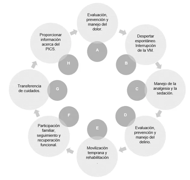 La GPC Early mobilisation and rehabilitation of paediatric intensive care patients, establece una serie de contraindicaciones para movilizar a los niños en situación crítica dependiendo de su patología o condición, aconsejando en esos casos el reposicionamiento en cama18 (anexo 2). Los objetivos de movilidad deben siempre plantearse de forma individual, según la condición basal del paciente, nivel de desarrollo, diagnóstico y pronóstico. Dos estudios piloto de Hopkins y sus colaboradores demostraron, además de la seguridad de la movilización en pacientes pediátricos, que la presión intracraneal (PIC) y las convulsiones sensibles al estímulo no aumentan con este movimiento. Destacaron también la importancia de la optimización de la analgesia y sedación para mantener a los niños despiertos y alerta, promoviendo así ciclos normales de sueño-vigilia. Todo ello contribuye igualmente a la participación en las actividades de rehabilitación8. Nutrición El tratamiento nutricional es fundamental para la prevención del PICS1. Se ha visto que la combinación de la movilización temprana y la terapia nutricional actúan conjuntamente previniendo la pérdida de masa muscular en pacientes ingresados en la UCI16. Asimismo, el déficit energético es compensado principalmente por el catabolismo muscular, lo cual conlleva a la pérdida de masa corporal magra, que se asocia con un mayor riesgo de mortalidad. A pesar de que diversas investigaciones han evidenciado que alcanzar un suministro mínimo de energía a través de la nutrición parenteral suplementaria desde la fase aguda se vinculó con una disminución de la PICS, la sobrealimentación podría ocasionar un deterioro de la autofagia y empeorar la UCI-AW. Por ende, es fundamental aspirar a un suministro de energía adecuado, evitando la sobreingesta en pacientes críticos. Por otro lado, varios estudios han informado que no es suficiente con proporcionar proteínas por sí solas para reducir el PICS, sino que son necesarias la actividad física y la rehabilitación para maximizar sus efectos1. Manejo del delirio En cuanto al delirio, existen diferentes medidas para su cribado al igual que intervenciones para reducirlo o evitarlo. A nivel farmacológico, emplear agonistas alfa-2 como la dexmedetomidina7,16 y la clonidina, evitando la utilización de opioides y benzodiacepinas. Además, hay evidencia de que el midazolam afecta negativamente en niños, ya que disminuye la calidad del sueño e incrementa tanto el delirio, la VM como la estancia en UCIP7. Por otro lado, a nivel no farmacológico, existen medidas como una buena higiene del sueño, movilización temprana y facilitar el apoyo familiar estableciendo, por ejemplo, una política de visitas sin limitaciones16. También, proporcionarles sus gafas o audífonos, en caso de que tengan, imágenes o juguetes de casa reduce el desarrollo del delirio7. Además, se está estudiando que la técnica de monitorización en tiempo real, donde se exploran las formas de onda o patrones neuronales, ayuda a diagnosticar la demencia temprana16. Gestión ambiental para la curación Es fundamental para la calidad del sueño del niño lograr un buen descanso que favorezca el ritmo circadiano. Esto se puede lograr mediante intervenciones adecuadas durante el día, y creando un ambiente tranquilo y oscuro por la noche7. Estímulos ambientales como el ruido o la luz tienen un impacto negativo en dicha calidad. Considerables estudios han reportado que en la UCI el ruido es desmesurado. Por esta razón, se ha estudiado en diferentes ensayos clínicos aleatorizados la efectividad del uso de dispositivos para la reducción de ruido, como pueden ser tapones para los oídos y auriculares. Gracias a estas medidas podríamos mejorar la calidad del sueño en la UCI, la cual algunos estudios plantean su relación con el deterioro cognitivo a largo plazo, estableciendo entonces la posibilidad de que una mala calidad del sueño influye en el desarrollo de delirio en la UCI1. Paquetes “ABCDEFGH” de liberación de UCI El proyecto de Liberación de la UCI de la Sociedad de Medicina de Cuidados Críticos consta de una serie de medidas para la prevención, la detección temprana y el tratamiento de todo tipo de secuelas ocasionadas por los cuidados intensivos. Este conjunto de medidas es conocido como los paquetes ABCDEFGH. En la medicina de cuidados intensivos para adultos, se ha evidenciado que la aplicación del paquete ABCDEF tiene efectos significativos en la supervivencia, el uso de VM, la duración del coma, la incidencia de delirio y el destino del paciente tras el alta de la UCI. Sin embargo, actualmente la investigación sobre PICS en niños y las posibles medidas preventivas o terapéuticas son insuficientes. Un estudio en 2020 de Walz y sus colaboradores sospechaba que estos paquetes tenían un efecto similar en niños, pero sería necesaria la obtención de una mayor evidencia en la población pediátrica, puesto que no existen recomendaciones específicas para dicha población7. Ilustración 4. Paquetes ABCDEFGH7. ![]() Las medidas “ABCDE” están dirigidas a los riesgos de sedación, delirio y movilidad, los cuales son considerados como factores predisponentes a desarrollar PICS. Por otro lado, las medidas “FGH” hacen referencia a la prevención y manejo del propio síndrome8. Sin embargo, es evidente la complejidad de establecer todas las medidas combinadas al mismo tiempo. Dicha dificultad está asociada principalmente a una mayor carga de trabajo de los profesionales de la salud, los cuales se encuentran en un entorno laboral que ya es considerado estresante y agotador7. Es necesario un equipo multidisciplinar para la implantación de estas medidas, así como la inclusión directa del paciente y su familia en el proceso8. Proyecto LiberAction Como hemos visto, una medida de prevención eficaz contra el PICS es el paquete ABCDEFGH; sin embargo, para llevarlo a cabo se requiere de muc