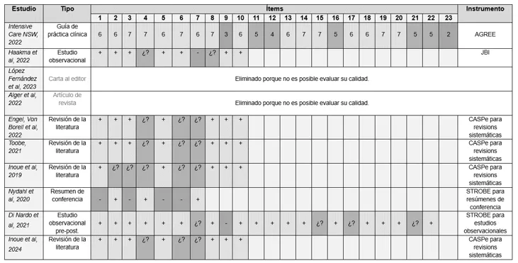 Además, dos artículos, una carta al editor y un artículo de revista, han sido descartados por mutuo acuerdo ya que no alcanzan la calidad buscada. Al contrario, sí que aceptamos 4 revisiones de la literatura ya que consideramos que son de gran interés para abordar las medidas de prevención del PICS en pacientes pediátricos.> Tabla 3. Evaluación crítica de los documentos finalmente analizados. (+) ítem presente, (¿?) ítem dudoso, (-) ítem no presente. ![]() Discusión Diarios de UCI La utilización de un diario de la UCI consiste en introducir anotaciones diarias sobre el estado de salud del paciente en la UCI, los episodios o cuidados que ocurren en el día a día o cómo va el proceso de recuperación, entre otras. Sin duda, la principal finalidad de estos diarios es narrar las experiencias del paciente durante su estancia8. Se utiliza un lenguaje cotidiano y cercano para facilitar su posterior comprensión16. Además, el diario es libre y personalizado. Principalmente, en el ámbito pediátrico, se deben de incluir escritos sencillos, fotografías, dibujos, pegatinas… que ayuden al niño a entender lo ocurrido a medida que va creciendo13. Tanto el personal sanitario que interactúa con el paciente como las propias familias, son los encargados de describir todos los aspectos mencionados. Incluso, si la situación lo permite, puede participar también el propio paciente1. Gracias a la diversidad de autores, el contenido del diario se ve enriquecido de los diferentes mensajes esperanzadores y cuidados proporcionados, destacando esa transparencia creada entre todos los miembros. Además, permite en cierta manera mantener el contacto con el paciente y transmitir la presencia de la familia y mostrarle su apoyo. Los objetivos de dichos diarios son múltiples y cada vez están respaldados con más evidencia, aunque se sigue indagando sobre sus objetivos específicos13. Principalmente, ayudan a prevenir el PICS reduciendo la ansiedad, depresión y síntomas del trastorno por estrés post traumático (TEPT)8. Esto se consigue gracias a que la lectura del diario tras el alta en la UCI consigue completar los vacíos de memoria, adecuando los recuerdos confusos y delirios16. También ayuda a la orientación del paciente1, y a comprender mejor todas las experiencias vividas durante la estancia, especialmente las negativas, las cuales por autodefensa intentamos borrar de nuestra memoria o las distorsionamos, creándonos más angustia el hecho de no recordar bien lo ocurrido13. Todos estos efectos positivos no ocurren solo en el paciente, sino que también se ve beneficiada la propia familia. Incluso para el resto de los profesionales que participan en el diario, el hecho de reflexionar el qué escribir, les ayuda a recordar que están ante personas, a la humanización de la atención, y a perfeccionar además la comunicación8. Generalmente, la implantación del diario la debate el equipo de enfermería responsable del paciente y, si finalmente se considera favorable, se explica el funcionamiento al paciente y a la familia. Tras la obtención del consentimiento requerido, se procede a la utilización del diario1. Este diario recaba la información desde el primer día de ingreso en la UCI (o cuando se haya decidido implantar), hasta el alta de la estancia en cuidados intensivos. Sin embargo, existe debate sobre cuándo entregar el diario completado, debido a que las alteraciones emocionales del paciente pueden apaciguarse tras la lectura de este o, por el contrario, provocar más dolor interno. Según el Informe de la Tercera Conferencia Internacional sobre el Diario de la Unidad de Cuidados Intensivos, el momento idóneo para entregar el diario es cuando el paciente esté consciente, orientado y emocionalmente estable, cuando haya acabado la situación traumática y cuando exista interés en el paciente por descubrir el progreso de su enfermedad con preguntas como “¿Qué me pasó?” “¿Cuánto tiempo he estado o estuve en la UCI?” “¿Por qué estoy tan débil?”13. En cuanto a la historia de los diarios de la UCI, fueron las enfermeras de Escandinavia las que comenzaron su uso en 1985. Posteriormente se extendió a países de Europa, Australia y América del Sur. Además, América del Norte también estuvo interesada en esta medida de prevención del PICS. A causa de estos avances, en Estados Unidos, el 1 de noviembre de 2018, se impartió la conferencia mencionada anteriormente. Su finalidad era fomentar los conocimientos, la motivación y el interés del uso de los diarios. Estuvo formada por 4 sesiones las cuales sus contenidos fueron describir el PICS, estrategias para implementar los programas de diarios de UCI, temas especiales y la rehabilitación psicosocial. Gran parte de sus participantes eran profesionales de enfermería13. Por otro lado, para responder a la problemática de los diarios escritos durante la pandemia de COVID-19 donde había restricciones de visitas y un estricto control de infecciones, se ofreció el diario digital “Post-UCI” y diferentes páginas webs o aplicaciones17: icu-diary.org8, ICUsteps, ICUTogether13. A pesar de todas las ventajas mencionadas, una exploración cualitativa realizada en 2020, relató que las diferentes barreras percibidas por el personal enfermero para la utilización del diario son: la falta de tiempo, la dificultad de escribir mensajes cortos y la poca integración de esta medida en sus rutinas de trabajo17. Movilización temprana y rehabilitación física Se cree que la movilización temprana (MT) y la rehabilitación de pacientes pediátricos críticos pueden evitar complicaciones, retrasos en la movilidad y estancias hospitalarias prolongadas18. Por “temprana” se entiende una rehabilitación física intensiva adicional a la atención regular recibida en cualquier UCI. Sin embargo, no queda claro cuándo está recomendado iniciar estas intervenciones1. La inmovilización convierte a estos pacientes susceptibles 