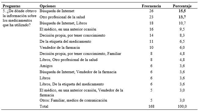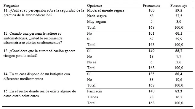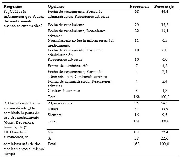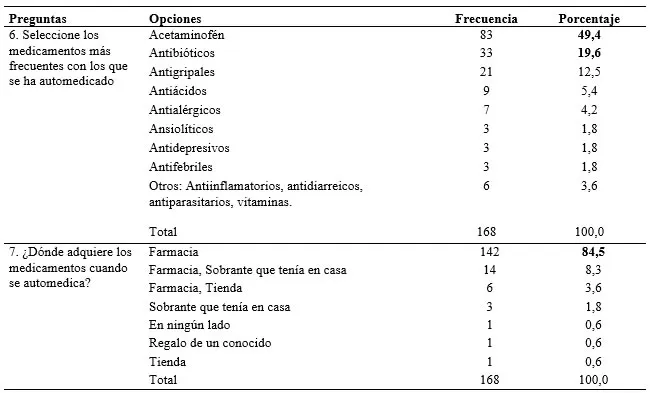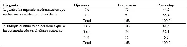 Abstract Introduction: Self-medication, understood as the consumption of medications without medical supervision, is a prevalent practice among nursing students. Factors such as academic pressure, access to medications and the false security derived from their academic training contribute to this problem. Objective: To analyze the consumption of medications without a medical prescription in students in the fifth, sixth and seventh semesters of the Nursing Degree. Methodology: A descriptive, transversal and quantitative study was carried out with a sample of 168 students. A validated instrument was used to collect sociodemographic information and self-medication practices. The data were analyzed using frequencies and percentages. Results: 55.4% of students reported self-medication, mainly to treat mild symptoms such as body aches (19%) and colds (13.7%). The main reasons were saving time and money (39.9%). The most commonly used medications were acetaminophen (49.4%) and antibiotics (19.6%). The Internet was the main source of information (15.5%). Although 88.7% recognized the risks, 59.5% considered self-medication “moderately safe”. Conclusions: Self-medication is common among nursing students, driven by the perception of convenience and prior knowledge. It is necessary to reinforce their training in the rational use of medications to guarantee safe and responsible practices in their future professional work. Keywords: Drug Utilization; Nursing Students; Over the Counter Drugs; Pharmacovigilance; Self Medication. |