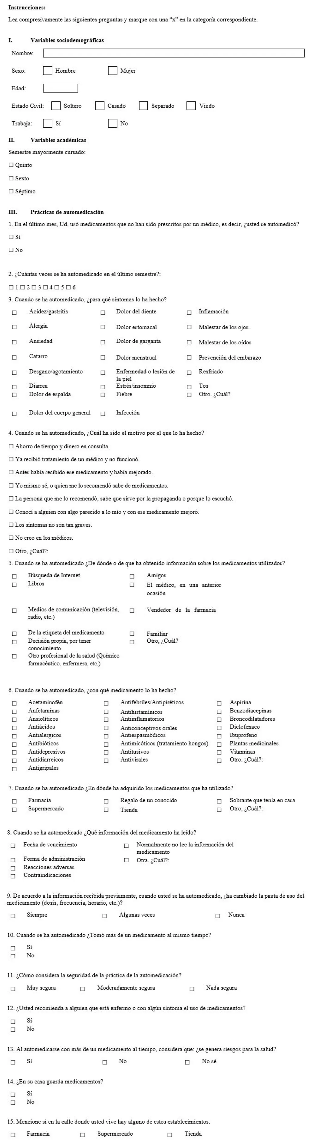 ANEXO. Encuesta para la recolección de datos. Instrumento de recolección de datos para identificar automedicación en estudiantes universitarios. ![]() |