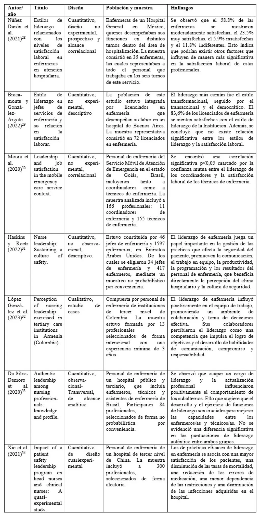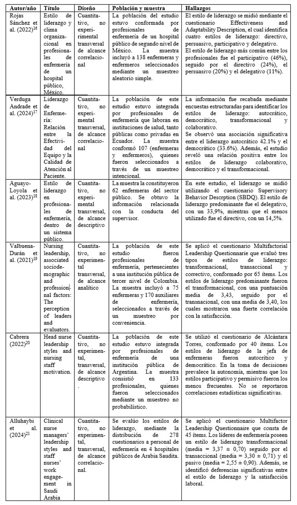 1. Lascano Sánchez AR, Salguero Fiallos CM, Guzmán Córdova, Díaz Vacacela BP, Tirado Velastegui RA, Rivera Núñez CM. Liderazgo de enfermería en tiempos de covid-19: una revisión sistemática. Cienc Lat. 2022;6(1):4620-37. Disponible en: https://ciencialatina.org/index.php/cienciala/article/view/1966/2821 [Consultado 22-01-2025] 2. Mendoza Quijano E, Tejada Muñoz S. Estilos de liderazgo y satisfacción laboral de los enfermeros, Hospital Regional Virgen de Fátima, Perú. Rev Cient UNTRM. 2020;3(1):9-15. https://doi.org/10.25127/rcsh.20203.566 3. Bracamonte LM González-Argote J. Estilo de liderazgo en jefes de servicios de enfermería y su relación en la satisfacción laboral. Rev Cient. Arbitr Fund MenteClara. 2022;7. https://doi.org/10.32351/rca.v7.265 4. Gonzales Castillo AM, Oblitas Guerrero SM, Mosqueira Moreno RP, Heredia Llatas FD. Liderazgo transformacional en gestión hospitalaria. Una revisión bibliográfica. Acta Méd Cent. 2023;17(4):819-34. Disponible en: http://scielo.sld.cu/scielo.php?script=sci_arttext&pid=S2709-79272023000400819 [Consultado 22-01-2025] 5. Villalobos M, Saltos I, Valle M, Mier G, Silva G. Liderazgo de enfermería en el contexto de la pandemia en Ecuador. Horiz Enferm. 2022;33(1):5-18. Disponible en: https://ojs.uc.cl/index.php/RHE/article/view/40185/ [Consultado 22-01-2025] 6. Carrera Casa MD, Egas Medina FP. Liderazgo y rol de enfermería en el equipo de salud. RECIAMUC. 2023;7(3):33-43. https://doi.org/10.26820/reciamuc/7.(3).sep.2023.33-43 7. Ramos Calisaya NG, Loli Ponce RA, Rivas Díaz LH, Rocha Zapana NM. Estado del liderazgo de Enfermería para la gestión de cuidado en establecimientos de salud. Rev Cubana Enferm. 2024;40:e5873. Disponible en: http://scielo.sld.cu/scielo.php?script=sci_abstract&pid=S0864-03192024000100020&lng=en&nrm=iso&tlng=es [Consultado 23-01-2025] 8. Guibert-Lacasa C, Vázquez-Calatayud M. Nurses' clinical leadership in the hospital setting: A systematic review. J Nurs Manag. 2022 May;30(4):913-925. https://doi.org/10.1111/jonm.13570 9. Organización Mundial de la Salud. Densidad del personal de enfermería y partería (por 10000 habitantes), 2024. [Ginebra]: Organización Mundial de la Salud; 2025. Disponible en: https://data.who.int/es/indicators/i/B54EB15/5C8435F [Consultado 23-01-2025] 10. Sampértegui B. Escasez de profesionales de enfermería afecta a Ecuador. 23 de mayo de 2023. En: Pontificia Universidad Católica del Ecuador. Conexión PUCE. Quito: [Fecha desconocida - ]. Disponible en: https://conexion.puce.edu.ec/escasez-de-profesionales-de-enfermeria-afecta-a-ecuador/ [Consultado 27-01-2025] 11. Escobar Baldeón CA, Torres Jara AC. Inteligencia emocional en el liderazgo y el trabajo en equipo de enfermería para la atención y seguridad del paciente. Polo Conoc. 2025;10(3):2059-81. Disponible en: https://www.polodelconocimiento.com/ojs/index.php/es/article/view/9174 [Consultado 27-01-2025] 12. González Hernández L, Jiménez Puerto CL, Hernández Vergel LL. Contenidos y prácticas de liderazgo transformacional de Enfermería para la gestión hospitalaria desde la superación profesional. Rev Cubana Enferm. 2024;40:e6655. Disponible en: https://revenfermeria.sld.cu/index.php/enf/article/view/6655 [Consultado 27-01-2025] 13. Reyna R. Liderazgo Transformacional en Enfermería y su Impacto en el Cuidado Humanizado: Fomento de Competencias Esenciales en Estudiantes de Enfermería. Visión 360. 2024;3(3):38-41. Disponible en: https://portalrevista360escueladeenfermeria.com/index.php/vision360/article/view/60 [Consultado 27-01-2025] 14. Arias Gonzáles JL, Covinos Gallardo M. Diseño y metodología de la investigación. Arequipa (Perú): Enfoques Consulting EIRL;2021. Disponible en: https://centrohumanista.edu.mx/biblioteca/files/original/ca1f49470aedb5e3372211fc3700173b.pdf [Consultado 15-02-2025] 15. Page M J, McKenzie J E, Bossuyt P M, Boutron I, Hoffmann T C, Mulrow C D et al. The PRISMA 2020 statement: an updated guideline for reporting systematic reviews. BMJ. 2021;372:n71. https://doi.org/10.1136/bmj.n71 16. Rojas Sánchez M, Rosas-González E, Xéque-Morales AS, García-Rodríguez I, Padrón-Méndez NZ. Estilo de liderazgo y clima organizacional en profesionales de enfermería de un hospital público, México. Sanus. 2022;7(18):e296. https://doi.org/10.36789/revsanus.vi1.296 17. Verduga Andrade LR, Zambrano Villaprado KE, Figueroa Andrade JM, Caro Delgado ME. Liderazgo de Enfermería: Relación entre la Efectividad del Equipo y Calidad de Atención al Paciente. Cienc Lat. 2024;8(1):6050-63. https://doi.org/10.37811/cl_rcm.v8i1.9951 18. Aguayo-Loyola T, Aguilera-Wall J, Cifuentes-Quintana V, Arias-Jiménez E, Montoya-Cáceres P. Estilo de liderazgo en profesionales de enfermería dentro de un sistema público. Med Segur Trab. 2023;69(272):139-48. https://doi.org/10.4321/s0465-546x2023000300002 19. Valbuena-Durán LD, Ruiz Rodríguez M, Páez Esteban AN. Nursing Leadership, Associated Sociodemographic and Professional Factors: The Perception of Leaders and Evaluators. Aquichan. 2021;21(2):e2125. https://doi.org/10.5294/aqui.2021.21.2.5 20. Cabrera OA. Head nurse leadership styles and nursing staff motivation. Salud Cienc Tecnol. 2022;2:54. https://doi.org/10.56294/saludcyt202254 21. Alluhaybi A, Usher K, Durkin J, Wilson A. Clinical nurse managers' leadership styles and staff nurses' work engagement in Saudi Arabia: A cross-sectional study. PLoS One. 2024;19(3):e0296082. https://doi.org/10.1371/journal.pone.0296082 22. Kim HO, Lee I, Lee BS. Nursing leaders' perceptions of the state of nursing leadership and the need for nursing leadership education reform: A qualitative content analysis from South Korea. J Nurs Manag. 2022;30(7):2216-26. https://doi.org/10.1111/jonm.13596 23. Mrayyan MT, Algunmeeyn A, Abunab HY, Kutah OA, Alfayoumi I, Khait AA. Attributes, skills and actions of clinical leadership in nursing as reported by hospital nurses: a cross-sectional study. BMJ Lead. 2023;7(3):203-11. https://doi