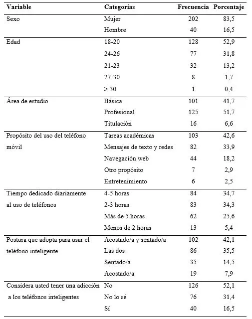 Introducción El rápido avance de las Tecnologías de la Información y la Comunicación (TIC) ha alterado significativamente las modalidades de la interrelación entre las personas, el aprendizaje y el desempeño profesional1. En este contexto, los teléfonos inteligentes han asumido un papel fundamental en la vida cotidiana, ya que permiten a los usuarios obtener información de forma instantánea, entablar una comunicación y ejecutar tareas con un único dispositivo portátil. Esta tendencia ha ejercido una profunda influencia en el panorama educativo, donde los estudiantes han adoptado la utilización de estos instrumentos para aumentar su rendimiento académico, el acceso a los recursos digitales y la productividad en sus actividades académicas2. A pesar de las ventajas pedagógicas que confiere esta innovación tecnológica, su uso generalizado y con frecuencia inapropiado, ha generado temores con respecto a la salud física y psicológica de los estudiantes3. Las investigaciones actuales han indicado un marcado aumento de la dependencia de los teléfonos inteligentes entre los estudiantes universitarios, lo que ha propiciado trastornos como la adicción a los dispositivos móviles y la fatiga tecnológica4. Estas conductas compulsivas suelen ir acompañadas de manifestaciones como la necesidad incesante por revisar el dispositivo, la ansiedad asociada a la desconexión y la dificultad para moderar su uso5. En los entornos académicos, si bien los estudiantes reconocen que estos dispositivos mejoran su eficacia académica, al mismo tiempo existe contradicción con respecto a esta eficacia y a las posibles consecuencias adversas que pueden surgir a largo plazo6. Una de las problemáticas más investigadas a consecuencia del uso excesivo de teléfonos inteligentes es el sistema musculoesquelético7. Las posturas prolongadas e inadecuadas que adoptan las personas al utilizar estos dispositivos, junto con los movimientos repetitivos ejecutados en espacios reducidos, se han correlacionado con la aparición de síntomas como molestias en la región cervical, la espalda, los hombros, las muñecas y los dedos8,9. Estas afecciones, a menudo sin importancia, pueden influir en las actividades diarias y requerir una intervención médica o farmacológica. Estos trastornos no solo ponen en peligro el bienestar físico de los estudiantes, sino que también pueden intervenir negativamente en su concentración, productividad y calidad de vida en general10. Los estudiantes de enfermería representan un grupo demográfico vulnerable a este problema, debido a que utilizan con frecuencia los dispositivos móviles como recursos de consulta y apoyo a lo largo de su formación académica y sus experiencias clínicas11. Además, suelen tener competencias digitales más avanzadas que estudiantes de otras carreras, lo que aumenta la frecuencia con la que utilizan teléfonos inteligentes para acceder a las guías clínicas, controlar los signos vitales, registrar información o calcular las dosis para la administración, como el goteo intravenoso (gotas/min), conversiones de unidades microgramos a miligramos, peso ideal, superficie corporal (BSA), diluciones, dosis pediátricas, ajuste de insulina y velocidad de infusiones, así como dosis basadas en la función renal (aclaramiento de creatinina). Esto optimiza y aumenta la precisión en los tratamientos12. Este incremento de la exposición, junto con las tareas universitarias y clínicas de la profesión, aumenta la probabilidad de desarrollar trastornos musculoesqueléticos13. Sin embargo, hay pocos estudios que se centren únicamente en esta población y en la correlación entre el uso de teléfonos inteligentes y los trastornos físicos derivadas de su empleo. Las investigaciones a escala internacional han demostrado la asociación entre el uso excesivo de teléfonos inteligentes y la manifestación de síntomas musculoesqueléticos. Así, por ejemplo, en el contexto de Arabia Saudí, se observó que las regiones más afectadas del cuerpo humano entre los estudiantes universitarios eran la parte superior de la espalda (70,3%), la región cervical (65,9%) y las manos o muñecas (68,7%)14. Otro estudio realizado en Turquía, corroboró una asociación significativa entre el uso de teléfonos inteligentes y las molestias en el cuello, los brazos, la espalda, las caderas y los pies15. En el mismo sentido, en la India, una encuesta realizada a 2000 personas de entre 18 y 25 años reveló una tasa de prevalencia del 44,05% del dolor que afecta al cuello, el pulgar, la parte inferior de la espalda y los codos16. La situación en América Latina es igualmente preocupante. En Brasil, se determinó que más del 55% de los estudiantes universitarios presentaban síntomas musculoesqueléticos en el cuello, espalda y hombros, que se atribuían al uso excesivo de teléfonos inteligentes y a unos hábitos posturales inadecuados17. También en Nicaragua, el 55% de los estudiantes de salud informaron haber sentido molestias en el cuello, mientras que el 42,4% informó de problemas relacionados con las manos y las muñecas18. Sin embargo, en Ecuador, identificaron que el 87% de los estudiantes que utilizaban teléfonos inteligentes de forma prolongada presentaban limitaciones cervicales, aunque no se estableció una relación estadísticamente significativa entre el uso del dispositivo y las alteraciones observadas19. Estos hallazgos subrayan una tendencia mundial que sugiere una posible asociación entre el uso prolongado de teléfonos inteligentes y la aparición de molestias musculoesqueléticas, aunque las correlaciones con frecuencia muestran una importancia débil. No obstante, existe un consenso entre los estudios sobre la necesidad imperiosa de concientizar acerca de la adopción de hábitos de uso saludables de estas tecnologías para disminuir los efectos adversos. El uso excesivo de teléfonos inteligentes ha sido vinculado a síntomas musculoesqueléticos e